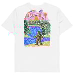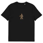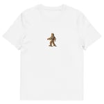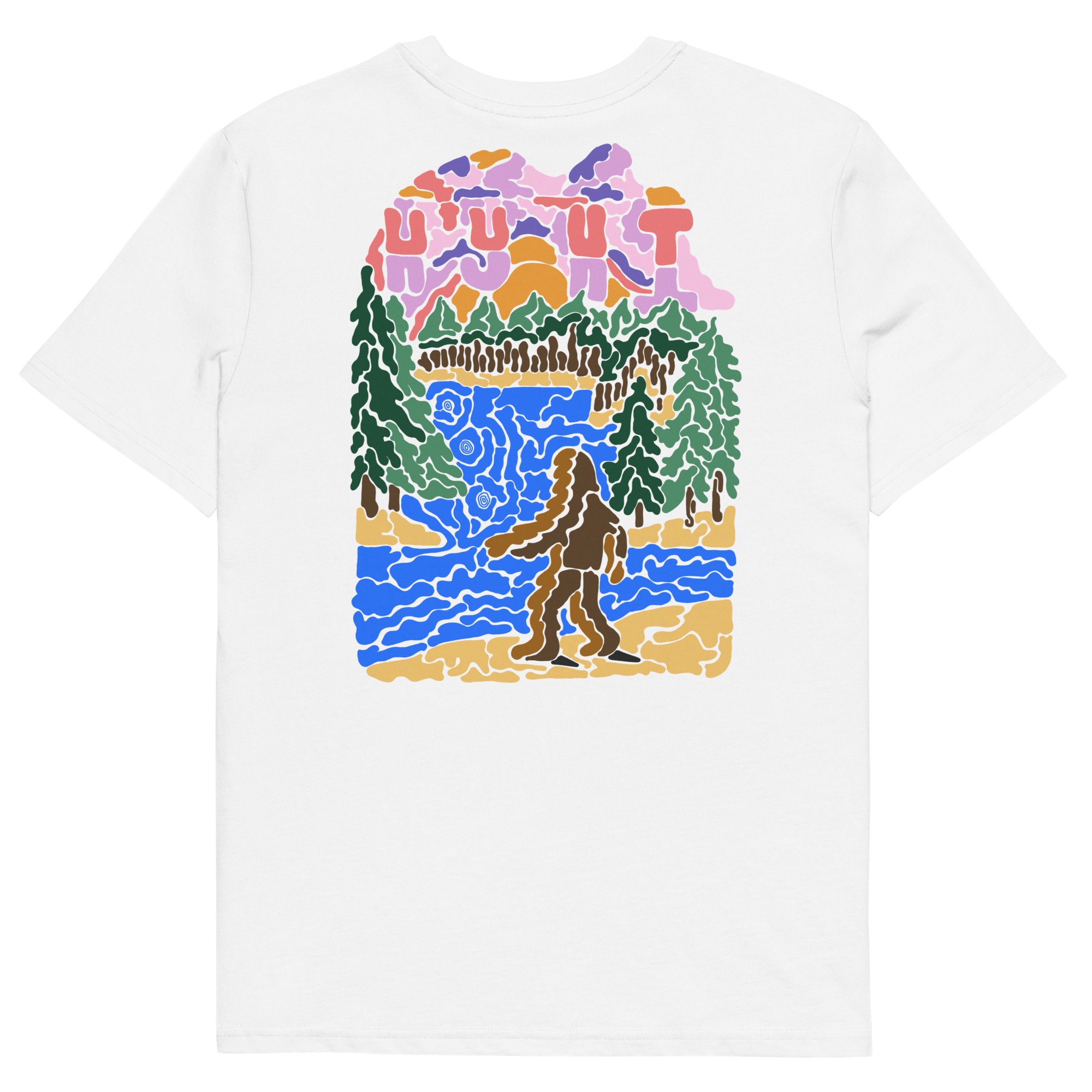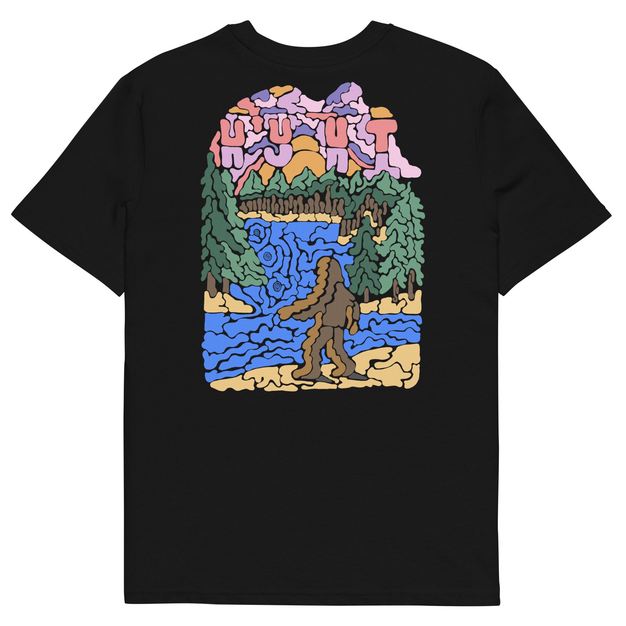 A playful tee featuring Bigfoot skimming stones across a quiet lake, blending myth with a moment of calm.